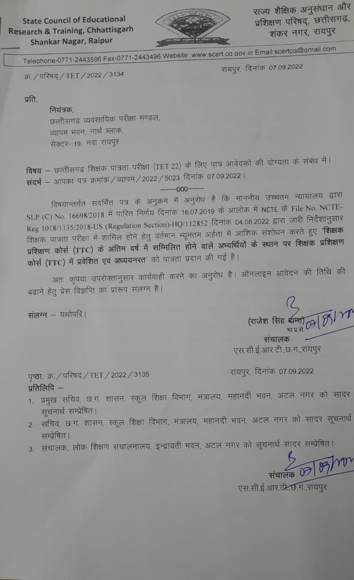 राज्य शैक्षिक अनुसंधान एवं प्रशिक्षण परिषद्, छत्तीसगढ़ के अंतर्गत शिक्षक पात्रता परीक्षा (TET22)- 2022
